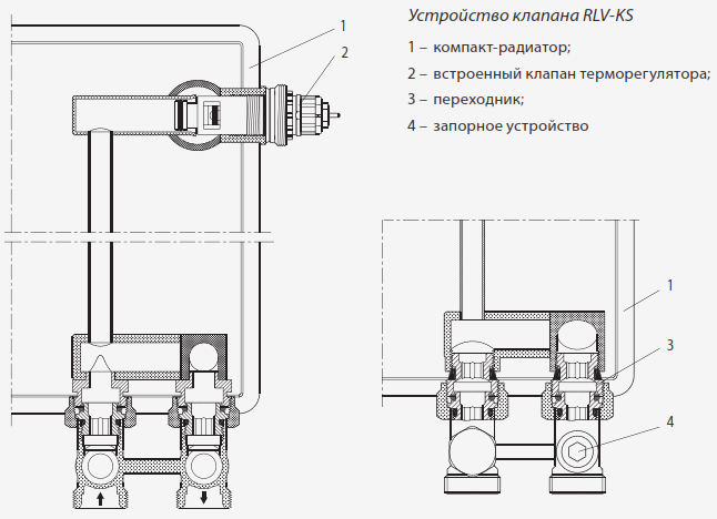 не подходит для присоединения к нему  спускного крана. С помощью RLV-KS можно отключить отопительный прибор для его демонтажа или  технического обслуживания без опорожнения  всей системы отопления.