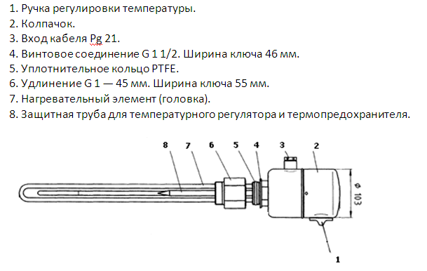 Рабочий корпус электронагревательного элемента и защитный колпачок датчика терморегулятора и предохранителя выполнен из медной трубки, покрытой никелем. Сам нагреватель, через латунный удлинитель, имеющий грани под гаечный ключ на 55, соединен с пластиковым корпусом. Существует, так же, вариант исполнения без латунного удлинителя. В корпусе имеется специальный выход для подключения электрического кабеля, а так же поворотный регулятор термостата, позволяющий устанавливать температуру прогрева воды от +45 до +80 оС.